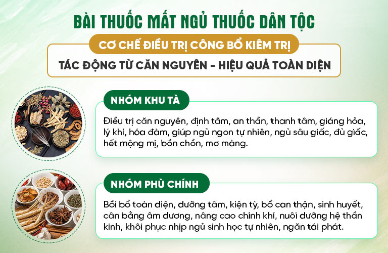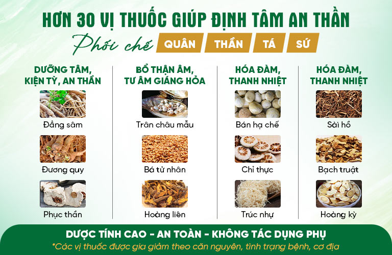 • Nhóm Phù chính: Song song với việc đẩy lùi tà khí, nhóm thuốc chú trọng nâng cao chính khí, bồi bổ thể chất, duy trì tâm trí ổn định, cải thiện chất lượng giấc ngủ.