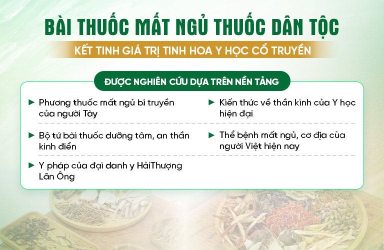 Trong đó, công thức thuốc trị mất ngủ danh bất hư truyền Quy tỳ thang của Đại danh y Hải Thượng Lãn Ông được lấy làm tiền đề phát triển. Cùng với đó, hàng trăm vị thuốc được phân tích và chọn lọc kỹ lưỡng nhờ vậy mang lại kết quả điều trị bệnh toàn diện.